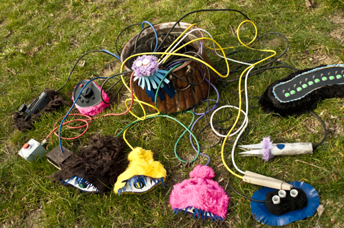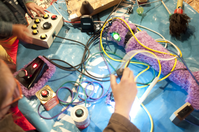 La séance de ce mardi a été principalement consacrée à la présentation par Olivar Premier de son « Oli-go », un instrument sculpture de son invention. Look d’un naïf revendiqué, comme un clin d’œil à l’enfance, du moins à l’esprit de jeu. On pense à un objet surréaliste, tenant à la fois de la machine et de l’animal : en témoignent les plumes, les poils colorés, les boutons flashy, le futurisme d’antan, qui font de cet Oli-go une grosse peluche multiforme d’anticipation.
