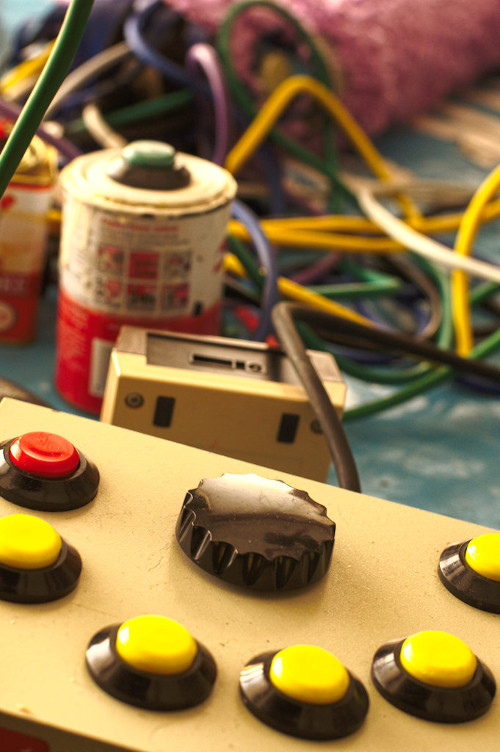 En y regardant de plus près, on distingue des boites genre Warhol, des caissons (de jouvence ?) munis de boutons poussoirs, ainsi qu’une molette et j’en oublie, tout un dispositif permettant de capter qui la lumière, qui les déplacements (la main, le corps), tandis qu’un gyroscope va se charger de tordre les sons comme un drap mouillé : d’où des étincelles, des grésillements, des vrombissements, des stridulations, ou au contraire des sons tenus,